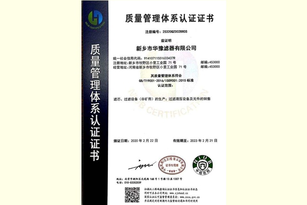 新鄉市華豫集團質量管理體系認證書